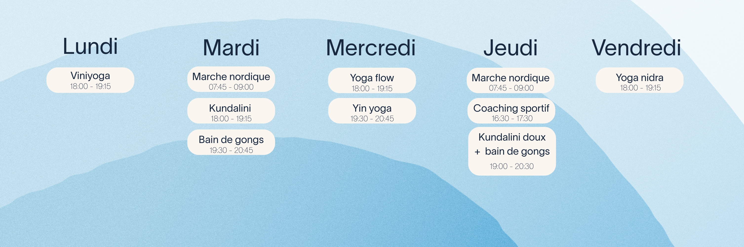 Yoga, bain de gongs, marche nordique et bien plus encore. Consultez la liste complète des activités ci-dessous.